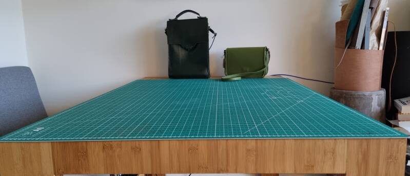 De mat voldoet, en ik heb maar een probleem, mijn tassen en huiden worden groter. Gelukkig kan ik alles op de huiden tekenen en in delen knippen met mijn leerschaar op de vloer. Gelukkig is de vloer voorlopig groot genoeg.