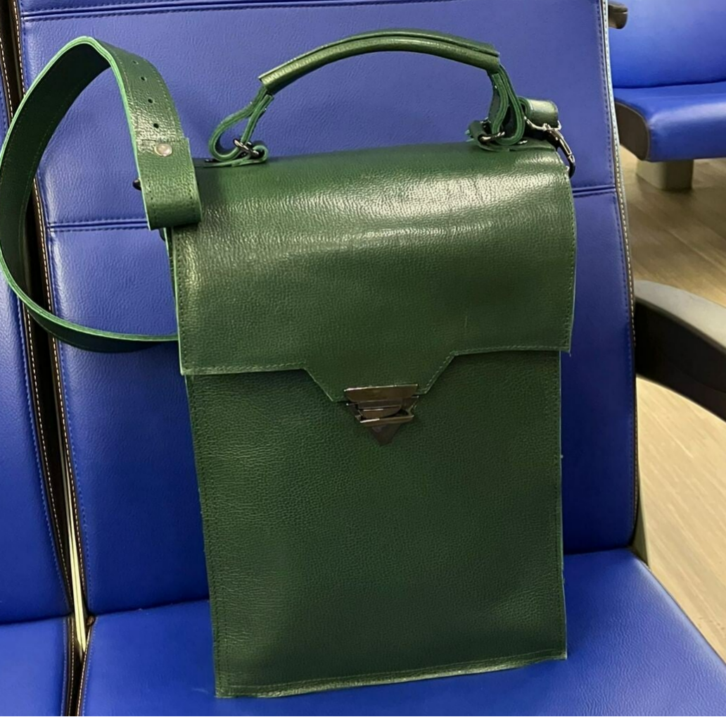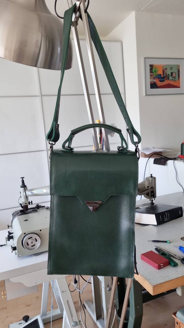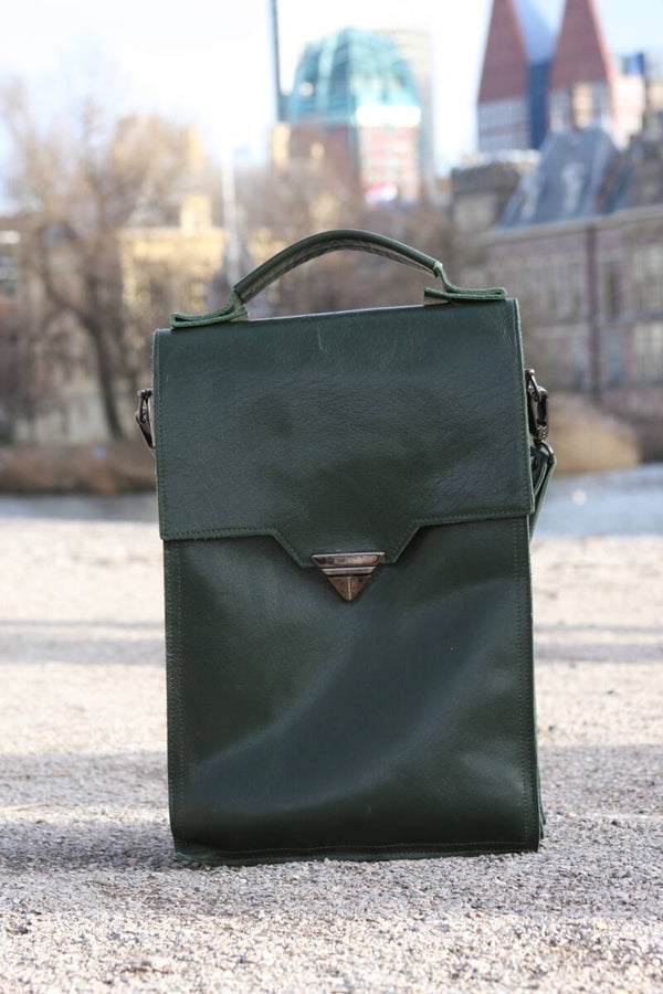 In de kantoortas 'Werk' past alles dat u voor een dagje werken nodig hebt hebt: een laptop, een of meerdere dossiers, wat pennen een schrijfblok, lunch en een flesje water. Deze tas heeft een handvat en een op maat gemaakte riem. De tas kan met een enkel vak, een dubbel vak of meerdere vakken worden uitgevoerd. Prijzen vanaf Eur 245,00 incl. btw. Hoewel de getoonde tas is uitverkocht, kan de tas worden besteld en naar uw wens worden uitgevoerd.